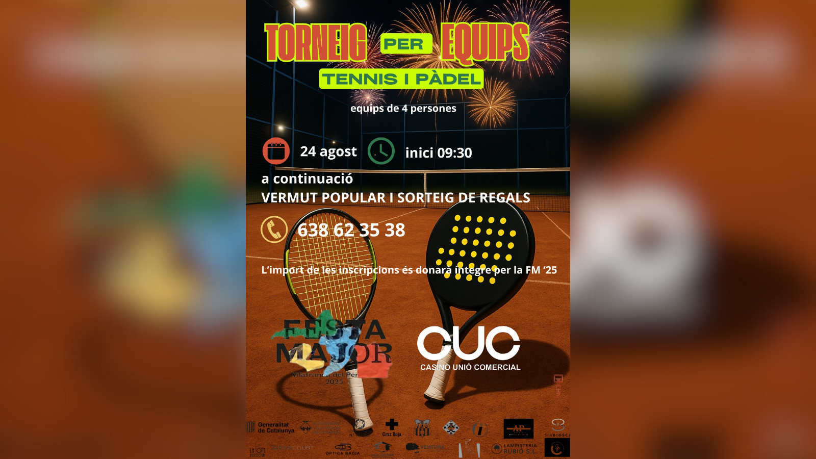 El Casino Unió Comercial organitza un Torneig de Tennis i Pàdel per equips que destinarà tota la recaptació a la Festa Major de Vilafranca. La cita serà aquest diumenge, 24 d’agost, a les 9:30h, a les instal·lacions del Club de Tennis Cinc Ponts. El torneig és per equips de 4 persones.