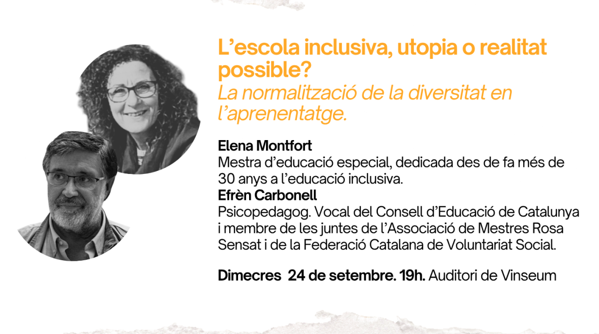 En aquesta ocasió, Elena Montfort, mestra d’educació especial, dedicada des de fa més de 30 anys a l’educació inclusiva, i Efrèn Carbonell, psicopedagog, vocal del Consell d’Educació de Catalunya i membre de les juntes de l’Associació de Mestres Rosa Sensat i de la Federació Catalana de Voluntariat Social, reflexionaran entorn a la pregunta ‘L’escola inclusiva, utopia o realitat possible? La normalització de la diversitat en l’aprenentatge’.