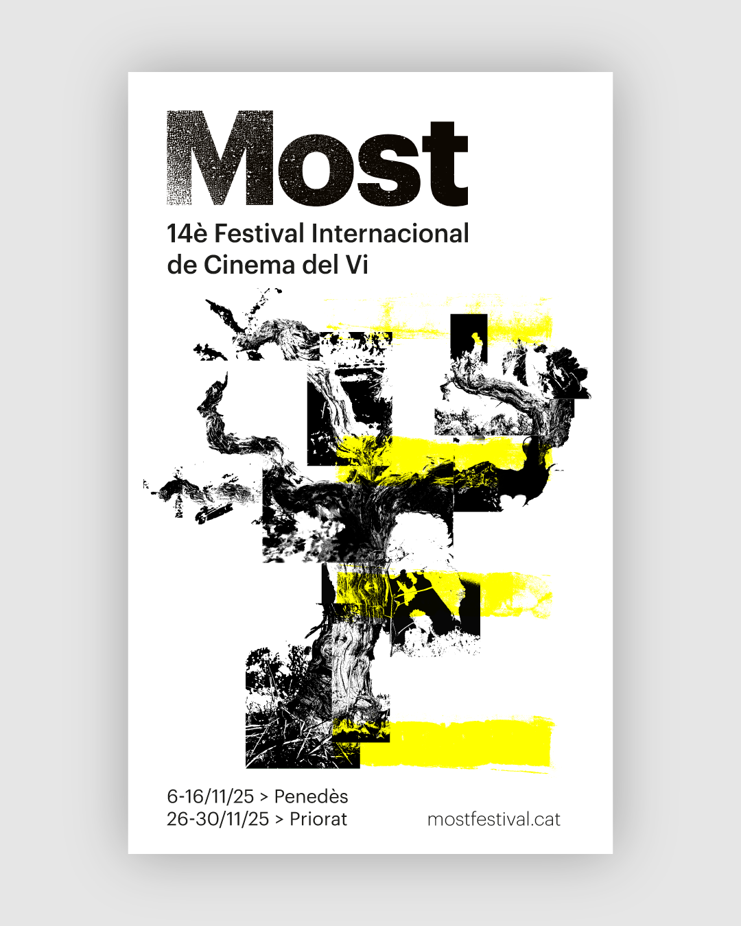 La imatge de la 14a edició del Most, creada per Miguel Ángel Cuesta, de l’estudi Miank Design de Vilafranca, es revela com un gran mapa col·lectiu de fotogrames, teixit a partir de la reconstrucció de vinyes diverses que habiten un mateix territori.