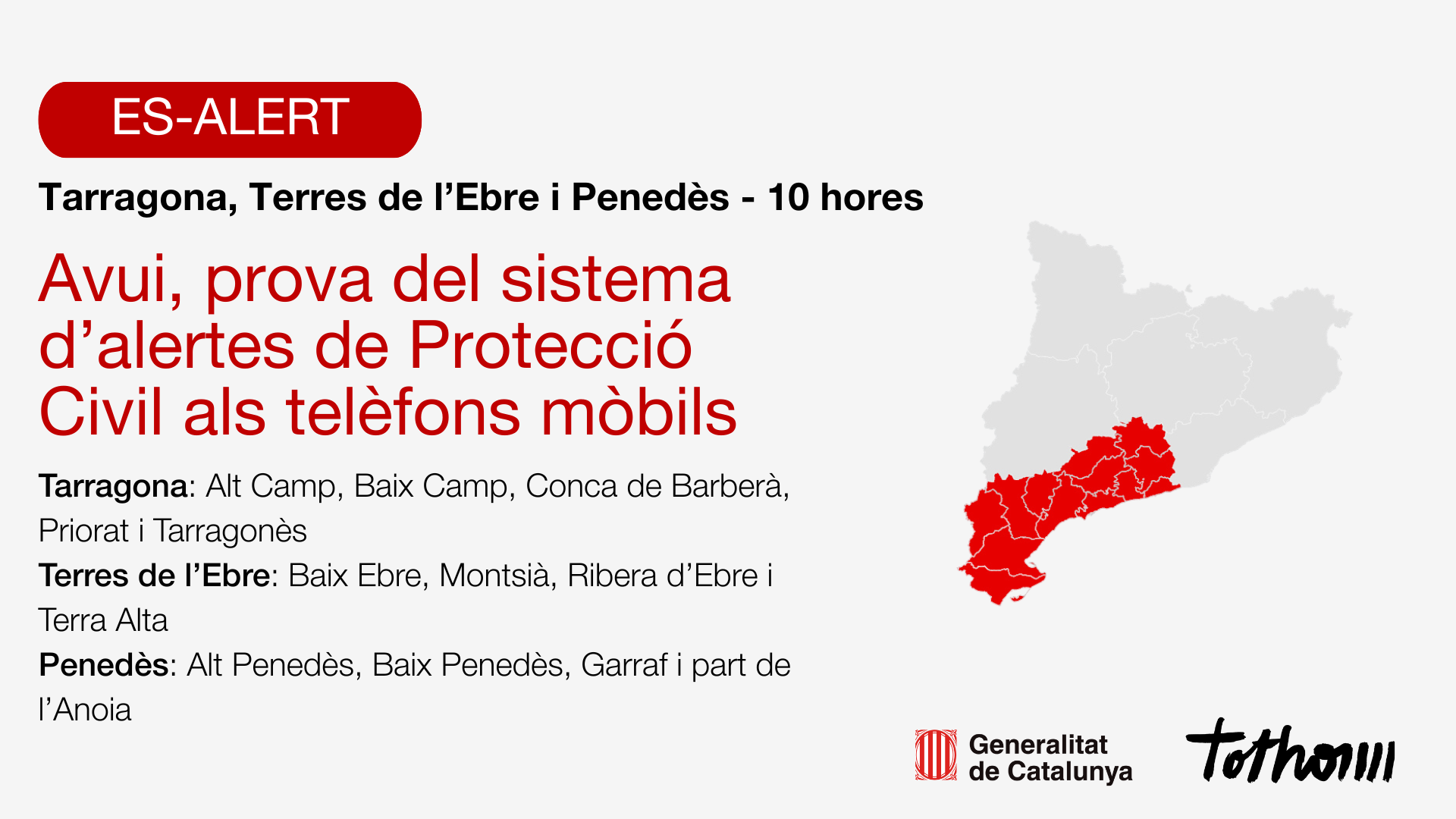 Avui dimarts, a les 10h, tots els telèfons mòbils intel·ligents que es trobin a les vegueries de Tarragona, les Terres de l’Ebre i el Penedès rebran un missatge de prova.