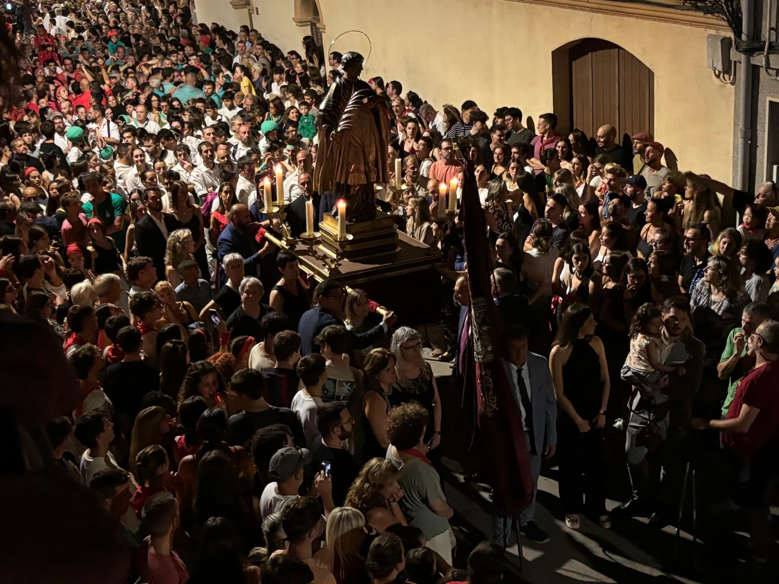 Diumenge va tenir lloc la darrera processó de la Festa Major d’enguany que, com és habitual, va sortir a dos quart de vuit del vespre des de la Basílica de Santa Maria, amb el seguici de tots els balls i elements fins al barri del Poble Nou, a casa de l’administrador Oriol Udina. Una processó seguida per moltíssima gent, que tenia un recorregut força curt i que va ser molt àgil, entrant el Sant a casa l’administrador a tres quarts d’onze de la nit quan l’any passat, per exemple, es va entrar a mitjanit. Abans de començar la processó, des del Ball de Panderetes Cristina Esteve destacava que enguany tenien forces membres del ball malaltes o lesionades, però que tot i així l’estaven vivint intensament. Al Ball de Panderetes enguany no s’estrenava ningú.