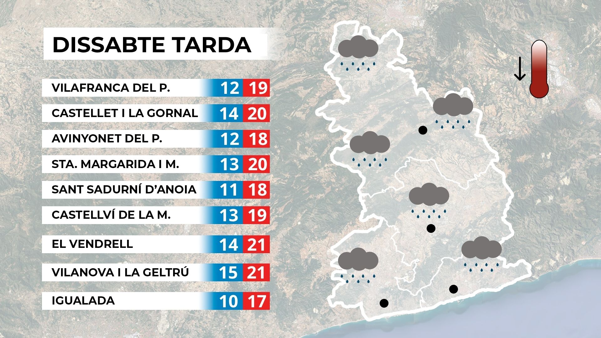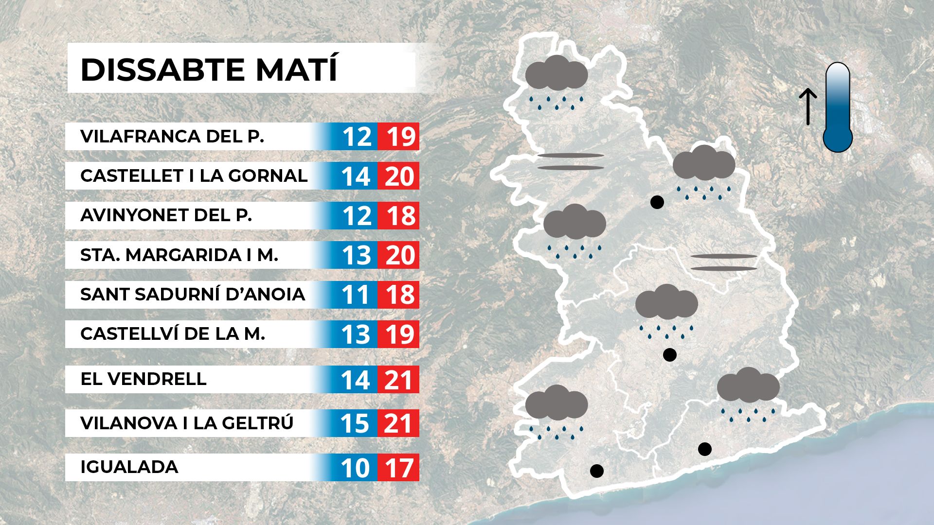 Dissabte començarà amb temperatures mínimes una mica més altes, però amb una sensació general de frescor. El matí serà variable, amb algunes clarianes que ràpidament deixaran pas a un cel més tapat i algunes oluges, sobretot a l’interior del Penedès, on no es descarten núvols baixos.