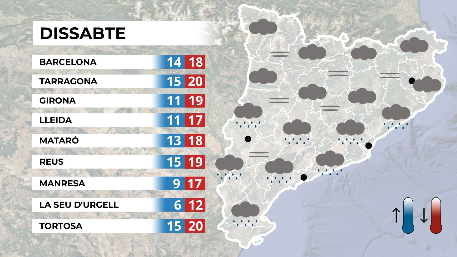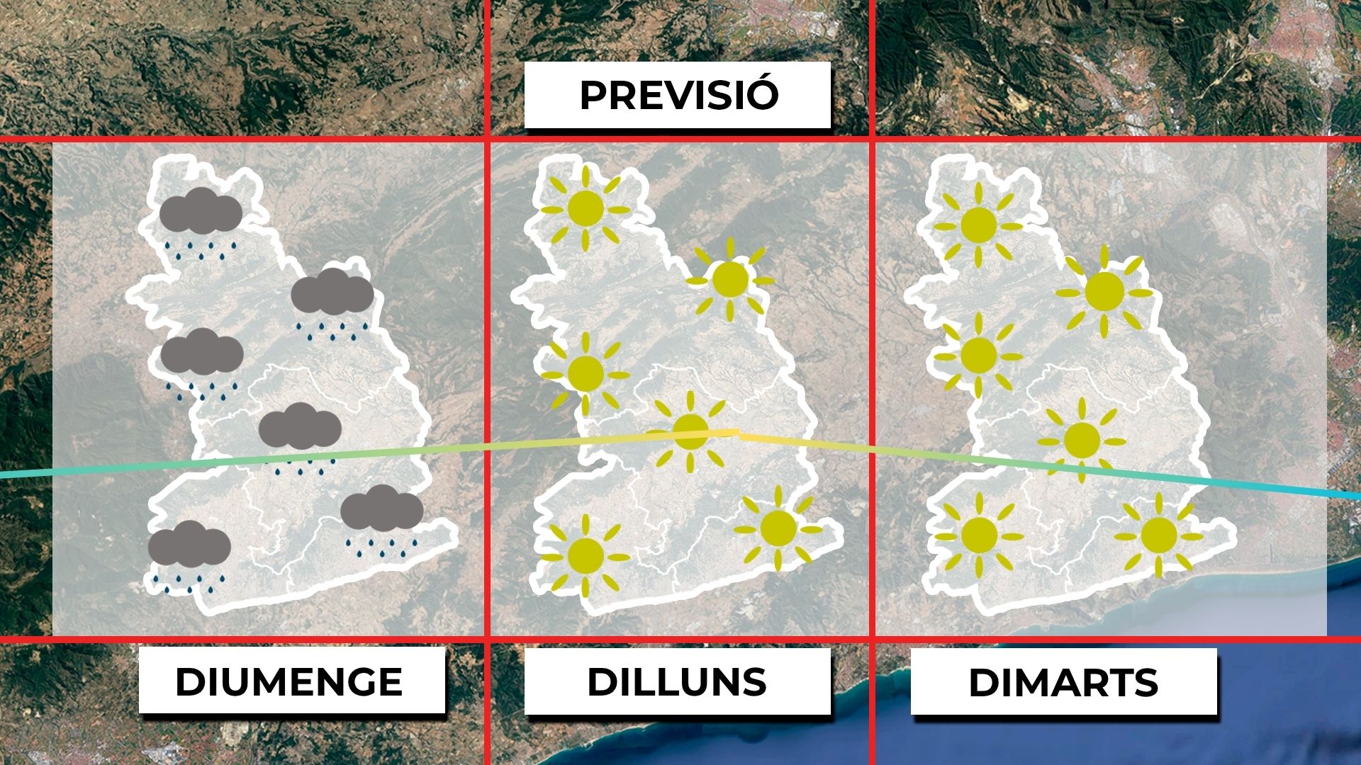 A la resta del país, la situació serà similar: matí amb estones de sol i els primers ruixats al sud i a Ponent. A mesura que avanci el dia, les pluges guanyaran extensió, amb boirines puntuals a la Catalunya Central i al Prepirineu.
