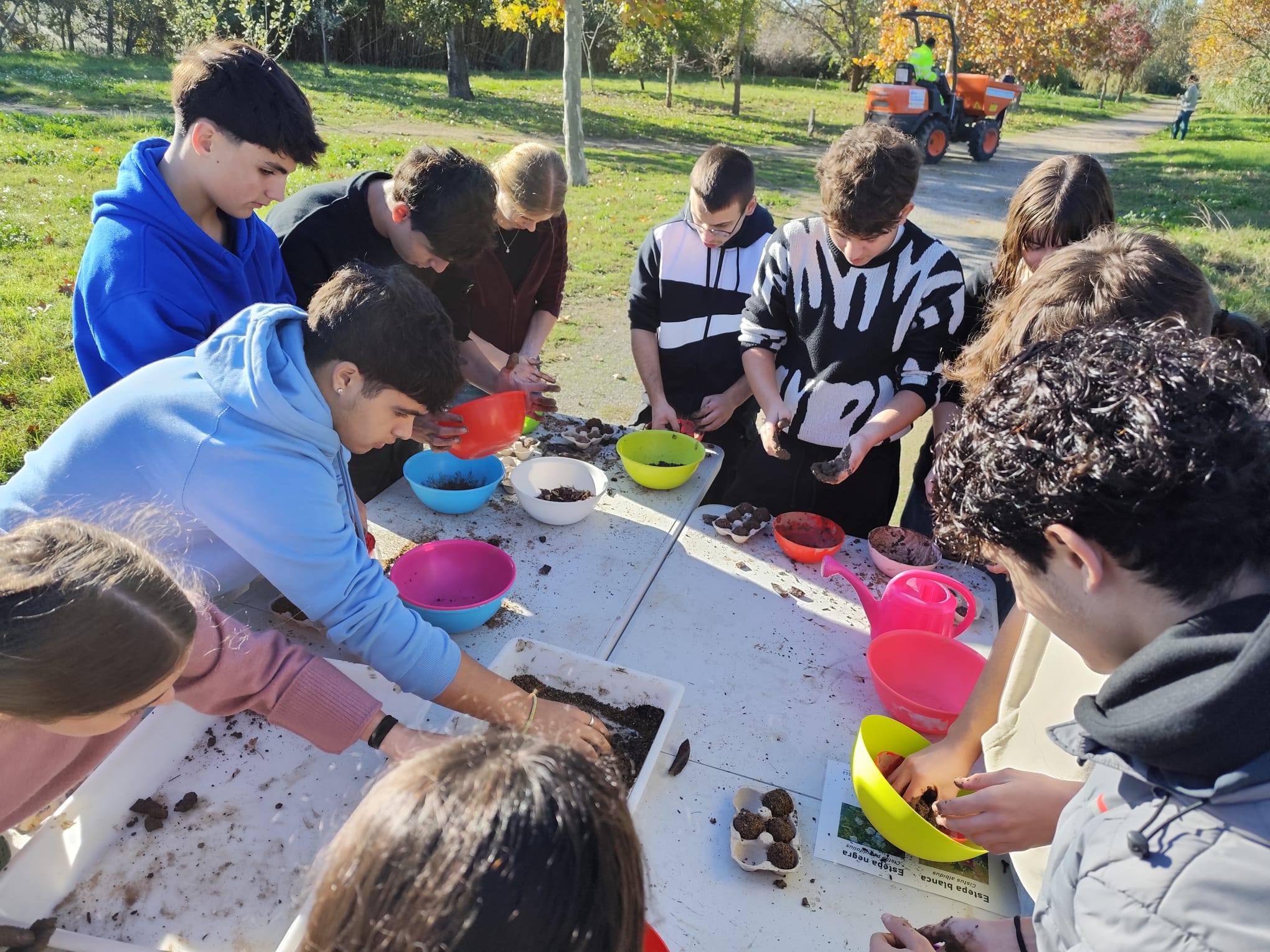 Durant la jornada, els joves van plantar espècies autòctones pròpies de les rieres, com el roure de fulla petita, el vern, el lledoner o el pollancre, entre altres, totes elles adaptades a l’ecosistema local i fonamentals per a la recuperació del bosc de ribera. La plantada es combinava amb una acció de ‘guerrilla verda’, on l’alumnat va elaborar i escampar bombes de llavors de plantes autòctones, afavorint la regeneració espontània de la zona. La Berta, la Foix i el Ton són alguns dels alumnes participants.