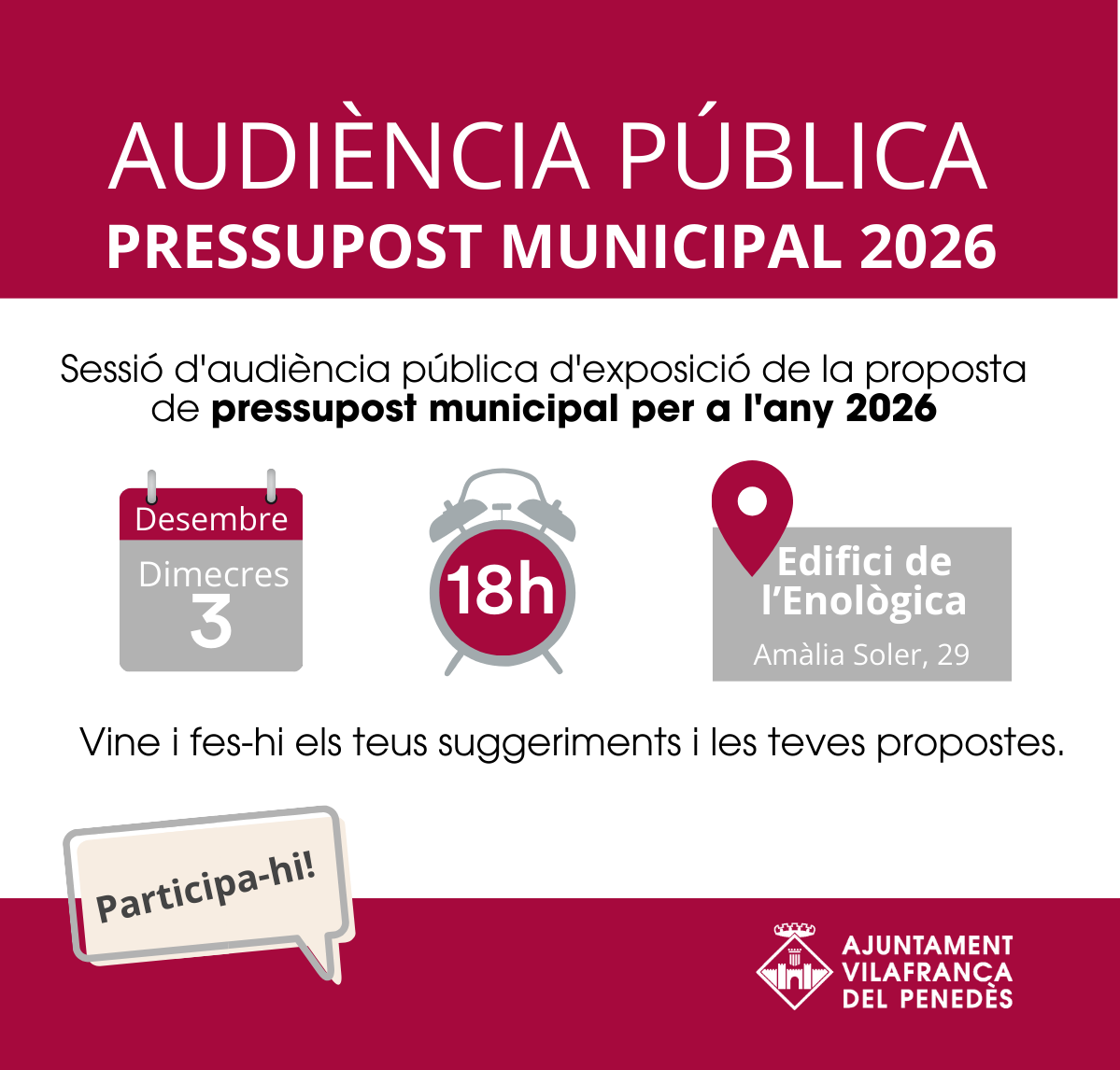 El proper dimecres 3 de desembre, a les 18h, se celebrarà a l’edifici de l’Enològica una audiència pública d’exposició del projecte de pressupost municipal per a l’any 2026.