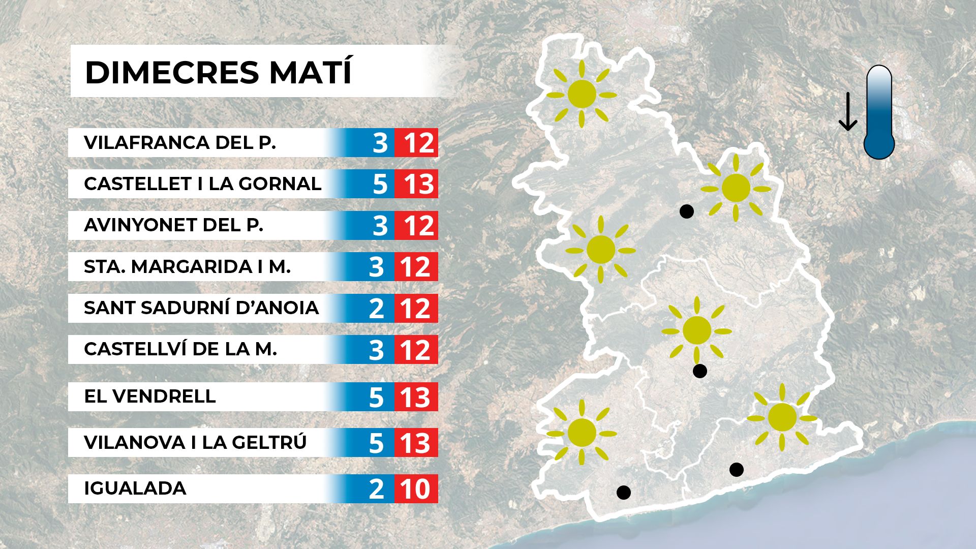 L’hivern s’avança i ja truca a la porta. Tot i que encara falta un mes per al solstici, el fred s’instal·larà durant uns quants dies. Aquest dimarts ja s’ha notat la primera baixada de les temperatures: les mínimes han quedat per sota dels 7 °C i aquest dimecres encara baixaran més, situant-se entre els 3 i els 5 graus a molts punts del Penedès.