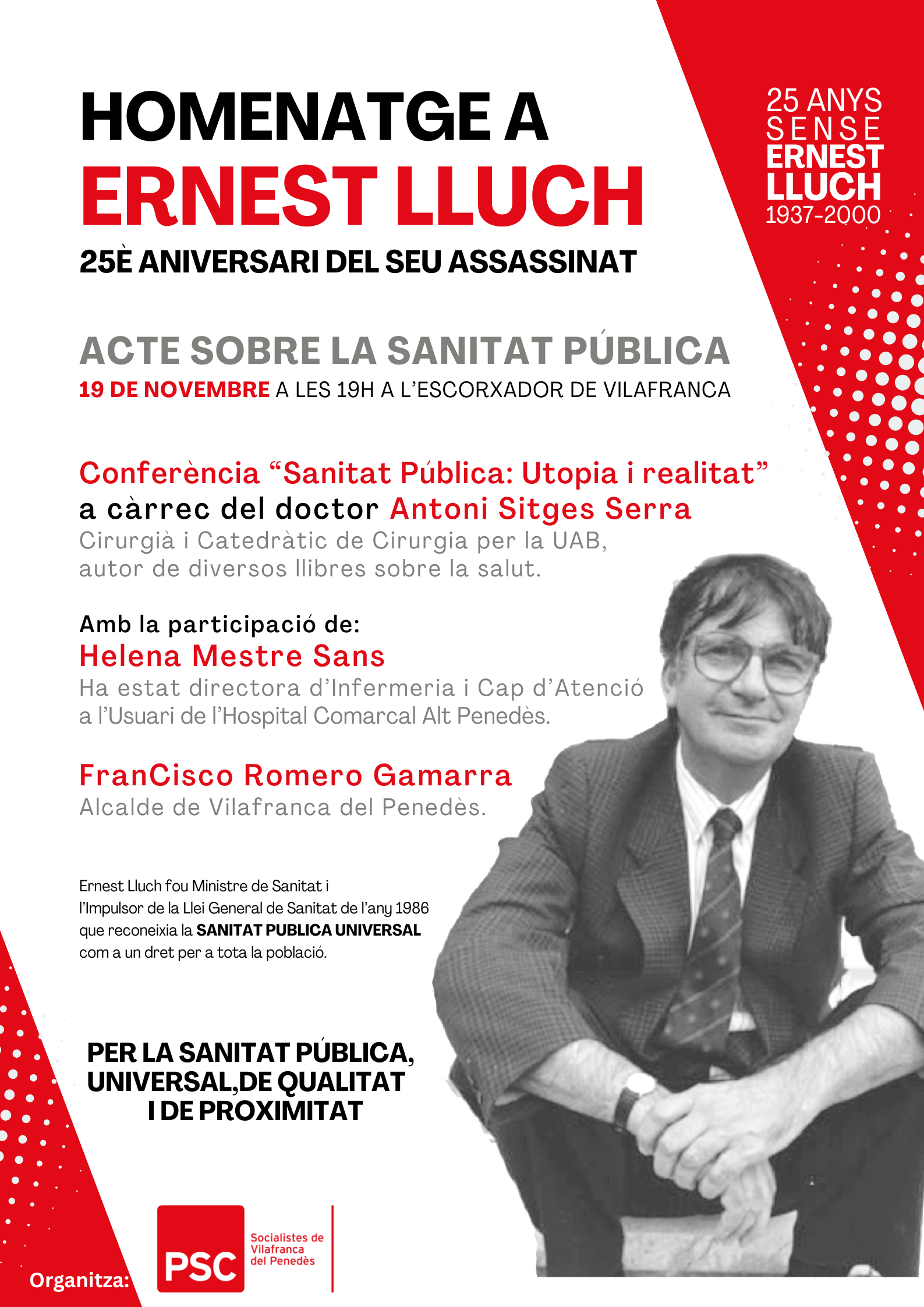 Sota el títol ‘Sanitat Pública: utopia i realitat’, el doctor Antoni Sitges Serra, cirurgià i catedràtic de Cirurgia de la Universitat Autònoma de Barcelona, reflexionarà sobre els reptes i les contradiccions del sistema de salut actual. Sitges Serra és una de les veus més reconegudes en el debat sobre el futur del model públic i l’impacte de la medicalització de la societat. L’acte comptarà també amb la participació d’Helena Mestre, que va ser directora d’Infermeria i cap d’Atenció a l’Usuari de l’Hospital Comarcal de l’Alt Penedès, que aportarà la visió de la sanitat de proximitat i el paper essencial dels professionals en el manteniment d’una atenció sanitària de qualitat. Tancarà l’acte l’alcalde de Vilafranca, Francisco Romero. Economista, intel·lectual i polític compromès, Ernest Lluch va ser ministre de Sanitat i Consum entre 1982 i 1986, durant el primer govern de Felipe González. Va ser l’impulsor de la Llei General de Sanitat de 1986, una de les reformes socials més importants de la democràcia, que va establir la sanitat pública universal com un dret per a tota la ciutadania, independentment de la seva situació laboral o econòmica. Va ser assassinat el 21 de novembre de l’any 2000 per la banda terrorista ETA, a l’aparcament de casa seva a Barcelona. Lluch havia defensat sempre el diàleg, la convivència i la raó com a camí per superar la violència.