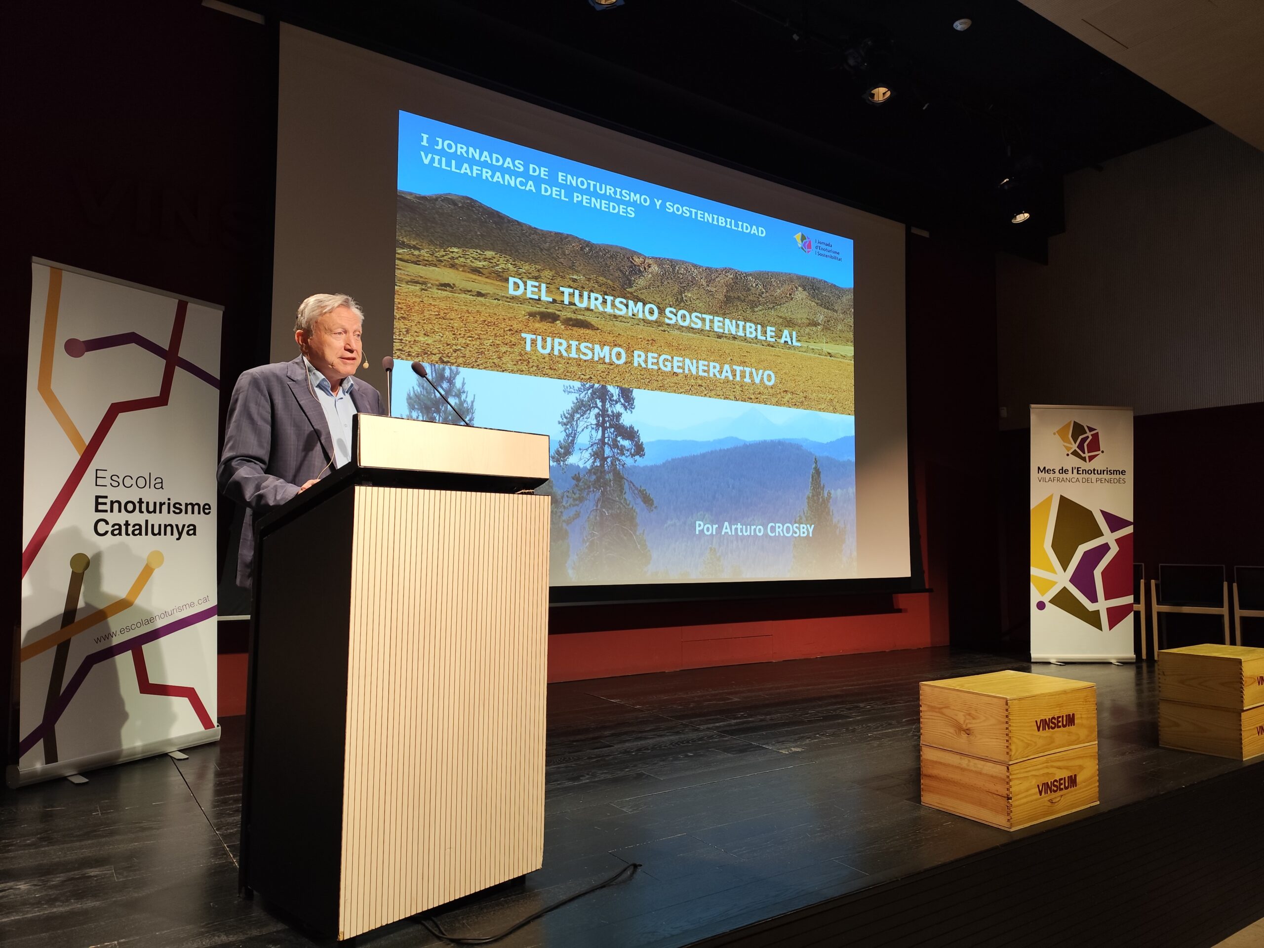 Una de les ponències de la jornada era la del CEO de Forum Natura i biòleg ambiental especialitzat en la Gestió i Innovació Sostenible de Destinacions Turístiques, Arturo Crosby, que va introduir el concepte de turisme regeneratiu. Crosby donava alguns exemples d’accions que ajuden a complir amb un turisme regeneratiu. Unes accions que Crosby considera que es poden aplicar també al nostre territori i a l’enoturisme en general.