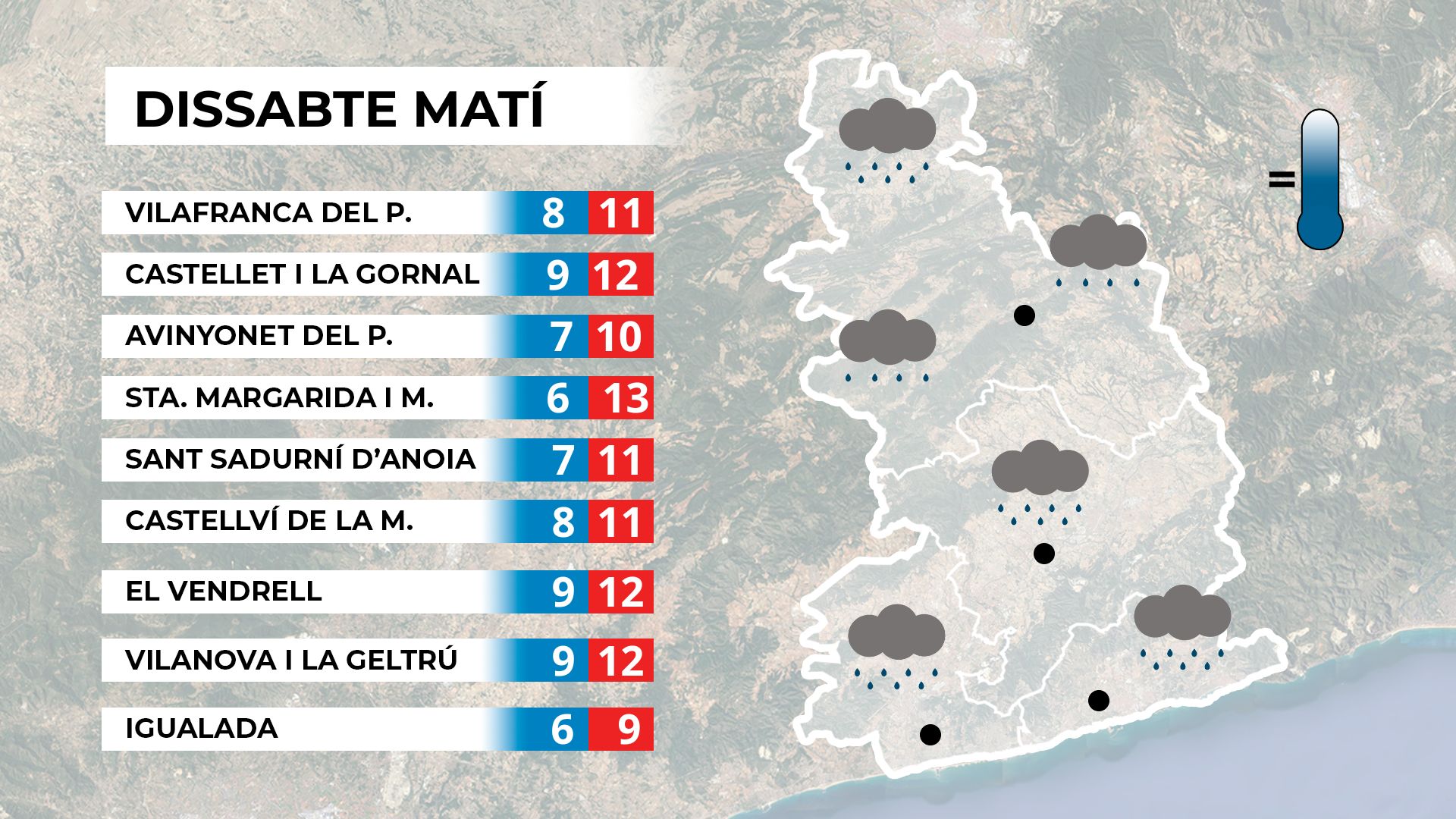 A la tarda la pluja continuarà de forma generalitzada, sense grans intensitats, però amb boires persistents que reduiran notablement la visibilitat. Les temperatures continuaran a la baixa.