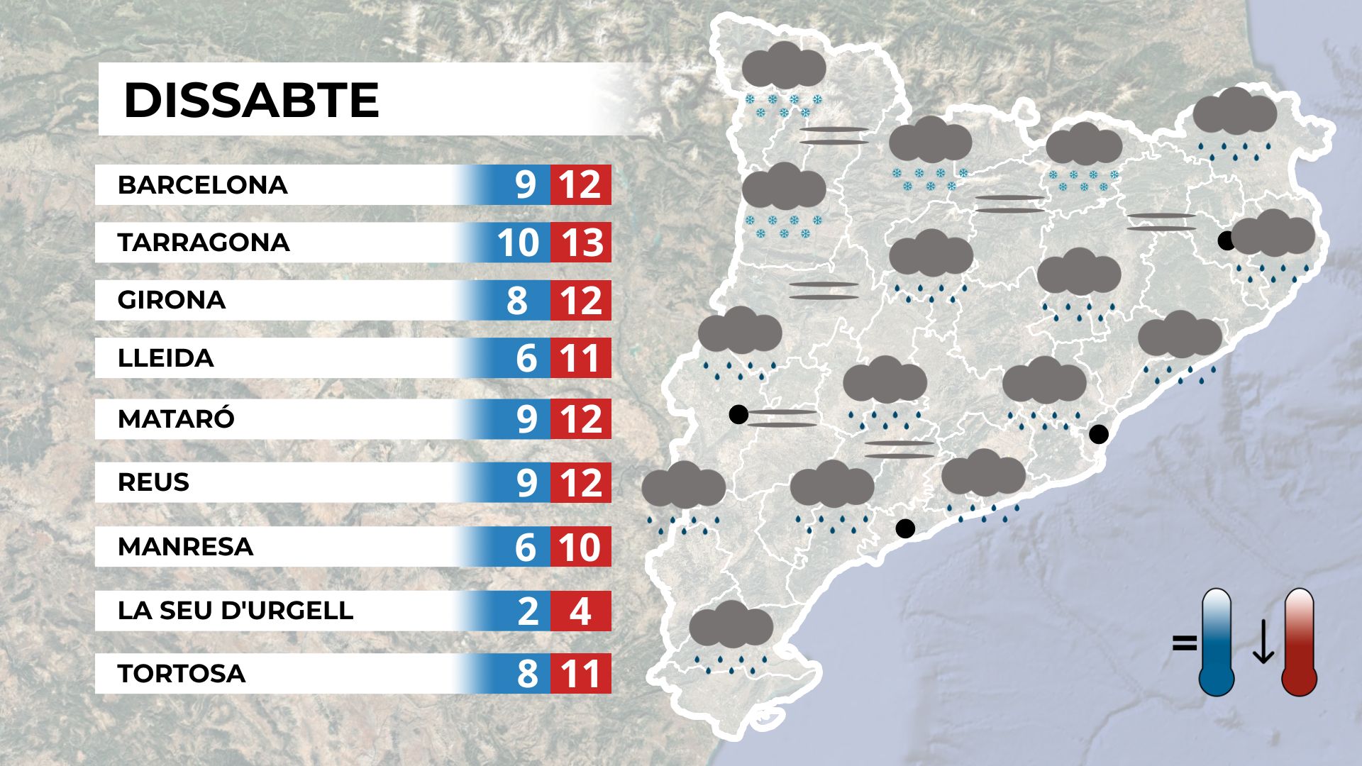 Aquest divendres a la tarda el sol encara podrà treure el nas de manera molt tímida. Progressivament, però, els núvols guanyaran terreny i les temperatures màximes començaran a baixar, sense superar els 15 °C en molts punts.