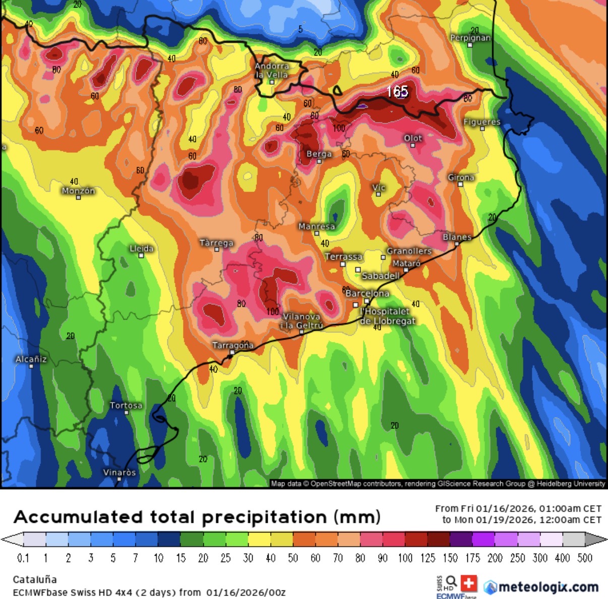 Al llarg de tot l’episodi es podran acumular més de 100 o 150 mm a molts punts del país, i localment superar els 200 litres