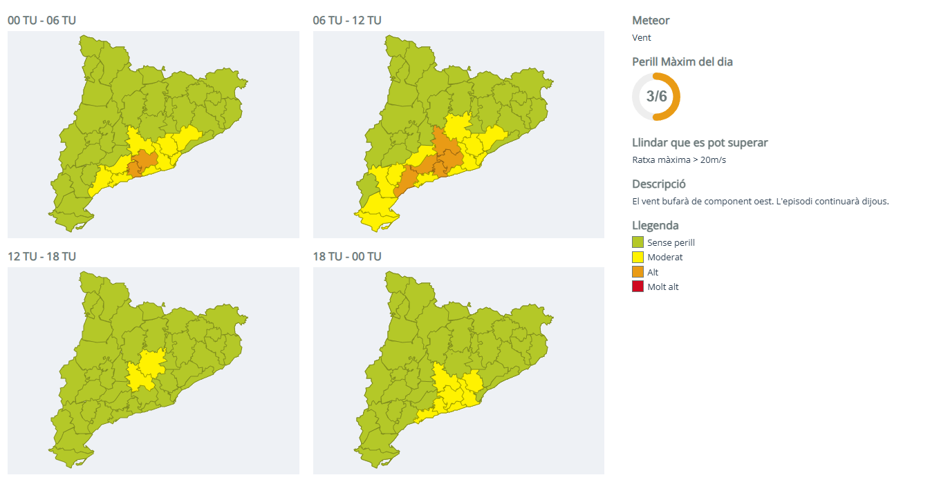 El vent bufarà de component oest i pot ser molt intens a les comarques de la vegueria del Penedès i Tarragona, en especial l’Alt Camp, Alt Penedès, Anoia, Baix Camp i Baix Penedès. L’episodi es preveu que continuï dijous de forma extensa.