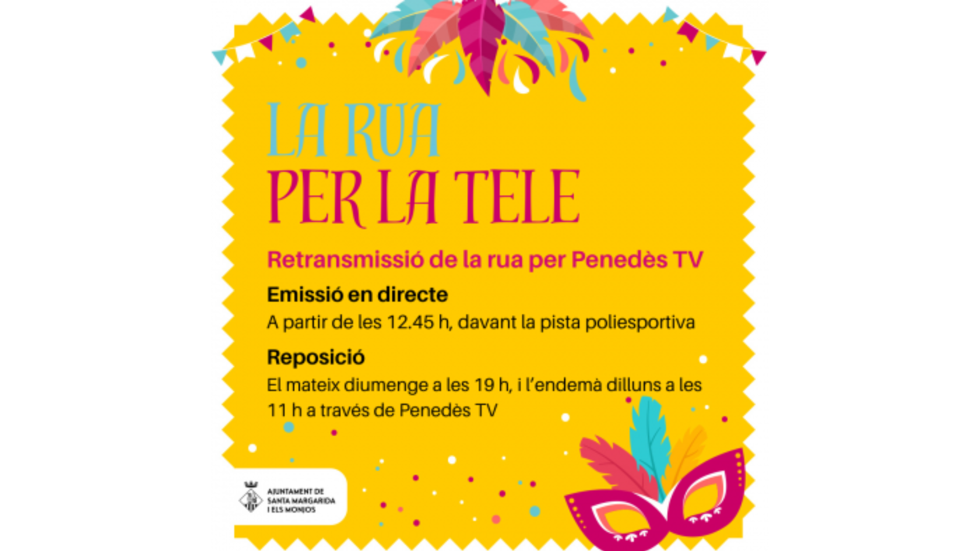 Penedès Televisió retransmetrà un any més la rua de carnaval dels Monjos, que es durà a terme aquest diumenge amb la participació de 18 carrosses, 6 de les quals són locals, i 6 comparses, 2 de les quals són locals.